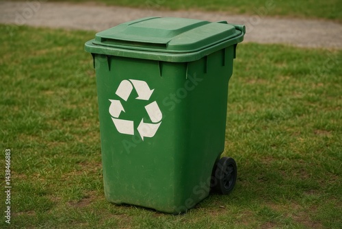 Green Recycling Bin on Grass Landscape with Eco-Friendly Symbol