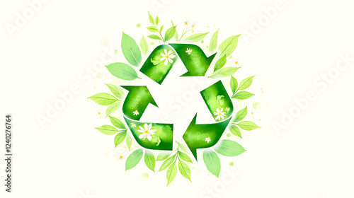 Green Recycling Symbol Surrounded by Fresh Leaves and Flowers Representing Environmental Conservation and Sustainability Initiatives