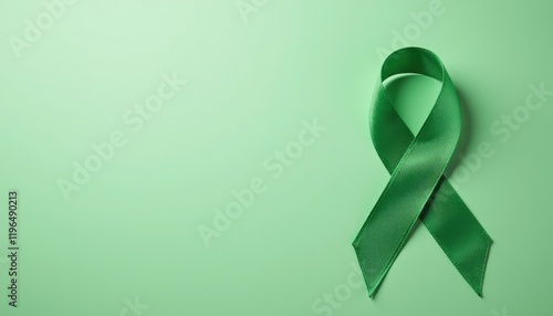 Green ribbon on light green background, top view with space for text. Cancer awareness campaign.
