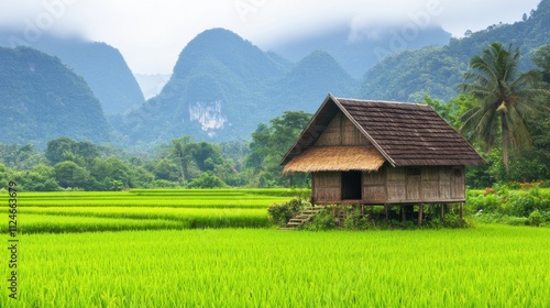 Green Rice Fields with Small Wooden Hut Under Cloudy Sky