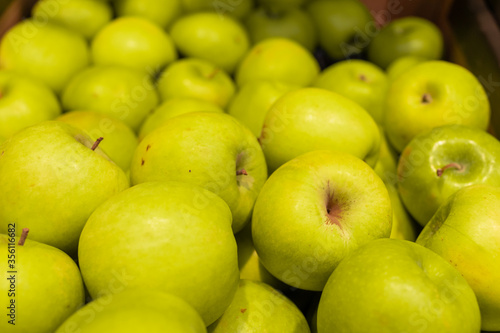 green ripe apples lie in one box. plenty of delicious juicy fruit. High quality photo