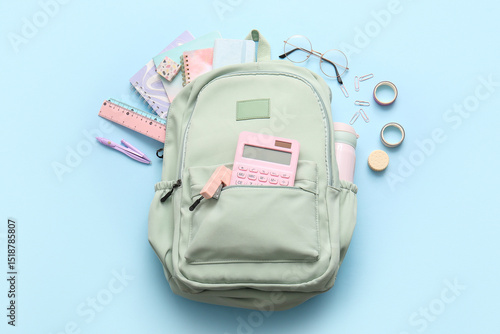 Green school backpack with different stationery supplies and eyeglasses on blue background
