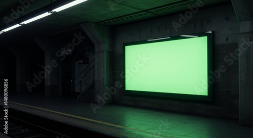 billboard, subway, station, platform, advertisement, urban, underground, train, transportation, transit, display, commercial, advertise, media, advertising, blank, poster, public, message, communication, modern, concrete, structure, illuminated, lighting, indoor, railway, track, screen, template, space, green, design, mock, up, urban setting, city life