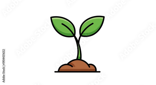 Green seedling with two leaves growing in brown soil symbolizing new life and growth in a simple cartoon style