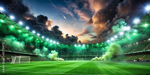 Green Smoke Engulfing Soccer Stadium Under a Dramatic Sky, Stadium, Soccer, Sports, Green Smoke
