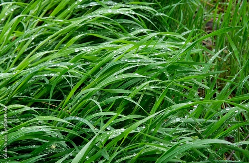 Green spring grass covered with raindrops. Spring background. Green background.