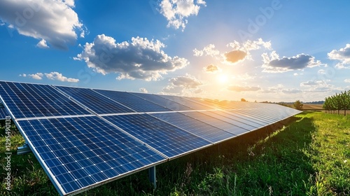 Green tech concept. Solar panels are illuminated by the setting sun, surrounded by lush greenery and a vibrant sky filled with clouds.