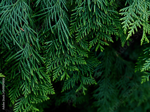 Green thuja tree branches background.