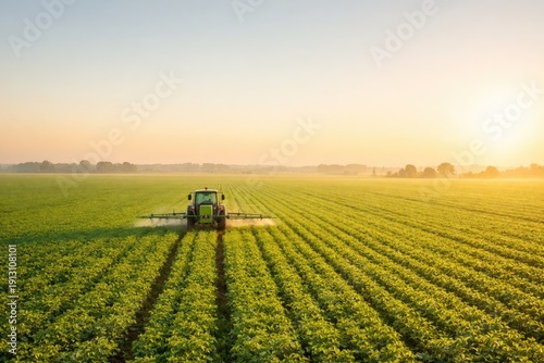 tractor, agriculture, farming, field, crop, spraying, pesticide, herbicide, fertilizer, sunrise, dawn, sun, light, warm, soft, gold, ray, sunbeam, farm, rural, landscape, nature, green, growth, cultivation, machinery, equipment, technology, modern, industry, work, process, harvest, season, organic, sustainable, agricultural machinery, farm equipment
