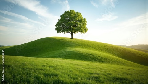 Green tree on grass hill under sky. Summer spring landscape with idyllic scenery nature background. Tranquil rural calm meadow view. Peace relaxation rural eco tourism concept.