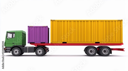 truck, shipping, container, cargo, logistic, transportation, delivery, freight, transport, yellow, purple, green, vehicle, commercial, business, industry, digital artwork, illustration, isolated, white background, colourful, box, import, export, maritime, distribution, trucking, haulage, trailer