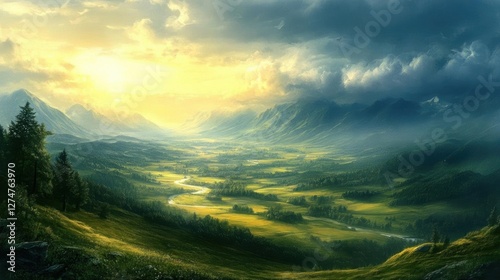 Green Valley Winds through Lush Mountains under Golden Sunlight, Peaceful Landscape.