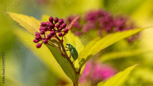 Green weevil on a spiral flower in a garden