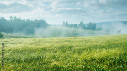 Green wheat field with fog and blue sky in the background. Beautiful summer landscape.
