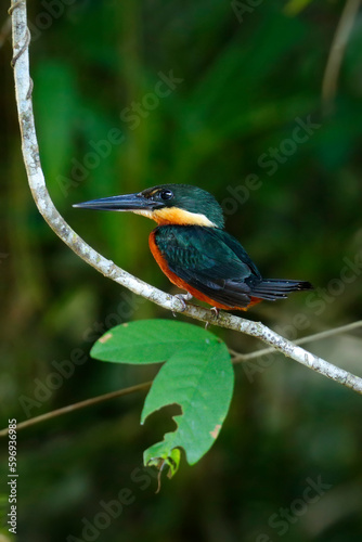 Green-and-rufous Kingfisher about to dive in river to catch fish