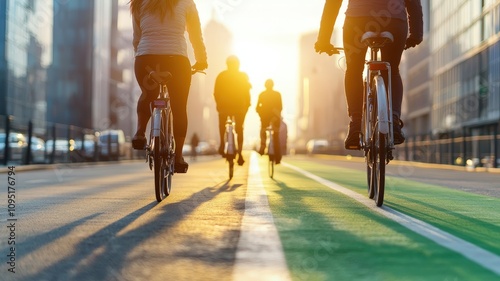 Greenery and sustainable environmental concept. Cyclists riding in a city at sunset on a bike lane.