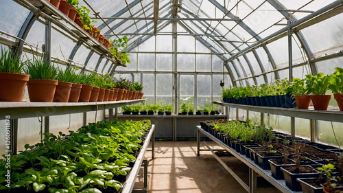 Greenhouse with rows of seedlings in pots