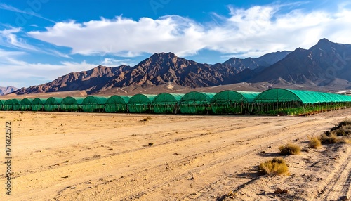 greenhouse, desert, landscape, mountain, agriculture, farming, environment, cultivation, plant, sky, blue, horizon, sunlight, outdoors, nature, ecology, growth, cultivate, produce, harvest, irrigation, climate, arid, dry, terrain, vegetation, cultivated, agricultural, farm, green, structure, construction, cover, protection, shelter, cultivating, growing, generating, sustainability, ecosystem, natural, region, area, field, vale, elevation, altitude, geology, formation