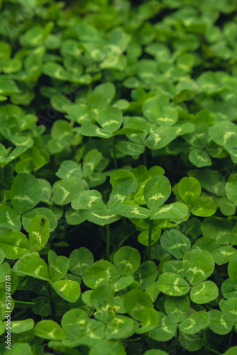Greenish cleaver natural background. Small green Clover leaves pattern background, Natural and St. Patrick's day background and shamrock wallpaper. Vacation and holiday clovers symbol, spring concept