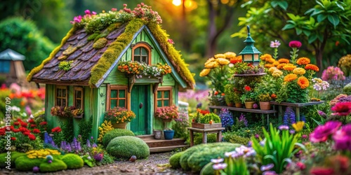 Green-roofed miniature cottage, vibrant flower garden, a surreal fantasy scene captured whimsically.