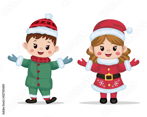 Greeting card with cute kids in Christmas costumes Holiday characters in winter season. Christmas, New Year. Vector, Isolated.