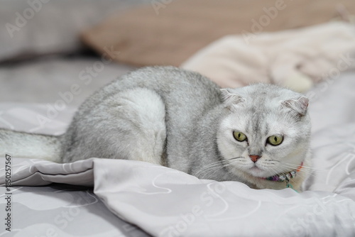 cat, pet, animal, domestic, grey, green eye, resting, cosy, bedding, pillow, indoor, soft, fur, cute, calm, curious, felino, relaxed, portrait, closeup, home, cuddle, comfort, adorable, whisker, playful, calmness, observation, sleeping, lifestyle, companionship, serenity, theme, warmth, peaceful, interaction, fluffy, charming, beautiful, domesticated, beauty, innocence
