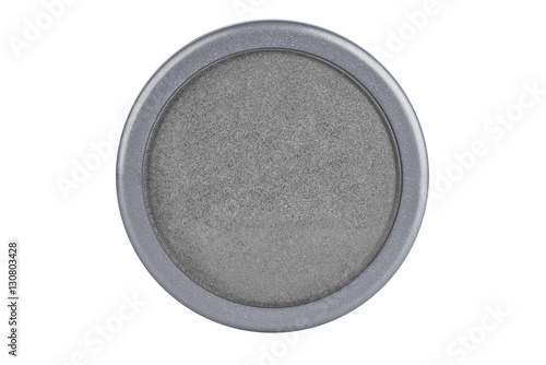 Grey color with glitter particles eyeshadow powder, in round grey container, beauty product isolated on white background