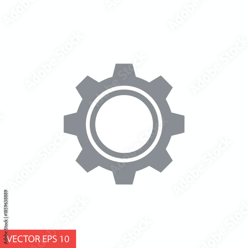 Grey gear icon with inner circle on white background, design for settings or technology