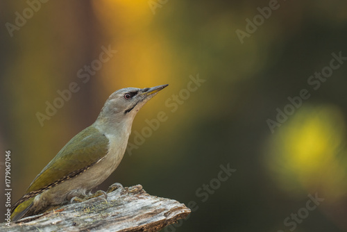 Grey headed woodpecker rests on a weathered log in a serene forest. The soft golden light enhances the bird's striking features, creating a peaceful atmosphere in nature.