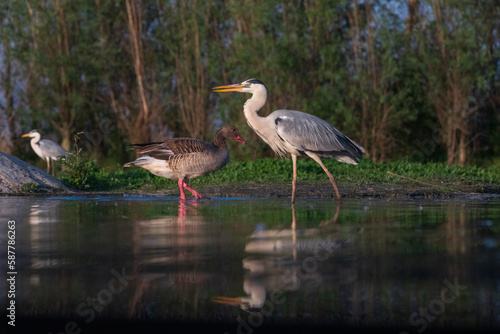 Grey heron and graylag in a pond