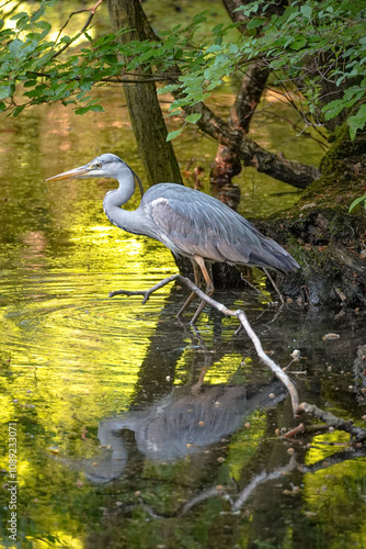 Grey heron (Ardea cinerea) standing in a lake with its reflection in the water, North Rhine-Westphalia, Germany