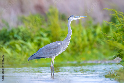 Grey heron, Ardea cinerea, waterfowl hunting in wetland