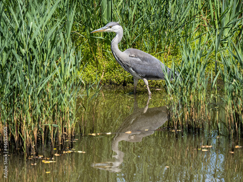 Grey Heron Hunting by a Reed Bank in a Lake
