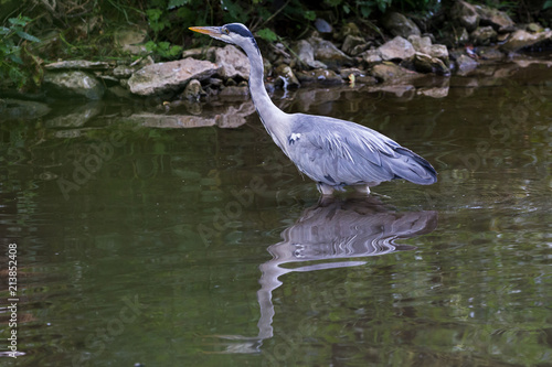 Grey heron wading into the water whilst hunting for fish during the summer of 2018 in the Cotswolds.