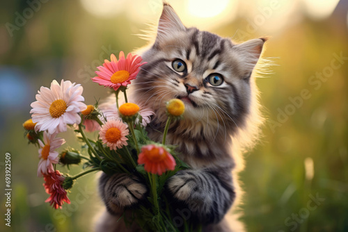 cat, flower, holding, looking, spring, garden, field, kitten, flower, young, funny, pet, animal, present, cute, beautiful, creative, gift, happy, smile, fun, nice, look, lovely, cat, dark, background, fluffy, concept, mother's day, postcard, february 14, male, love