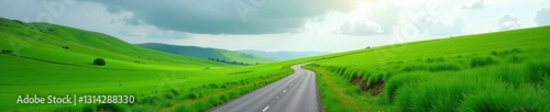 Grey sky over winding lane, lush green fields , nature, cycling, asphalt