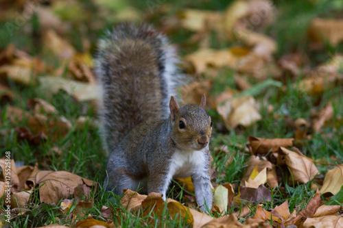 Grey squirrel in autumn park, telephoto