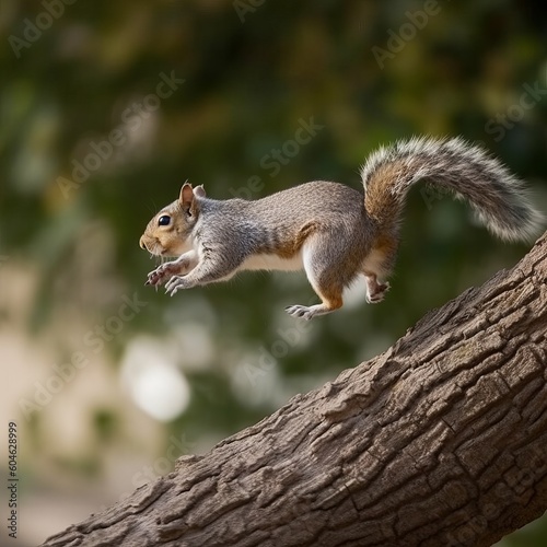 grey squirrel jumping on a branch in front of leaves, created with generative ai tools