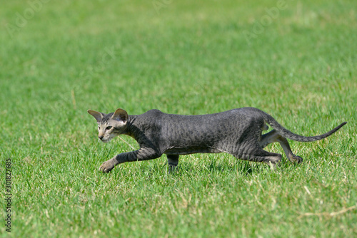 Grey striped oriental cat sneaking on the green summer grass lawn.