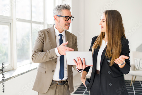 Grey-haired businessman engages with younger colleague, sharing a tablet screen in bright, modern office space. Their animated conversation and collaborative posture underscore concept of mentorship