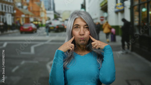 Grey-haired senior woman making a playful expression on a busy urban street, showcasing street life with cars and pedestrians in the background.