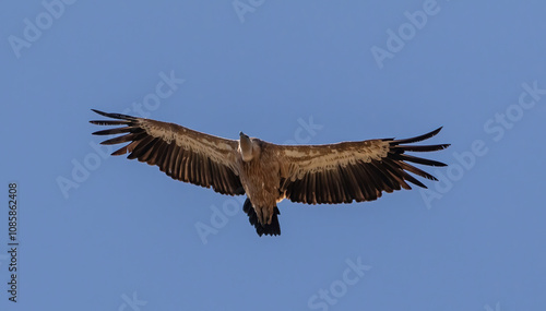 Griffon Vulture (Gyps fulvus) flying against blue sky, near Plakias on southern Crete, Greece.