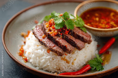 beef, rice, grilled, slice, spicey, sauce, food, dish, meal, lunch, dinner, cooked, cookery, asian, delicious, plate, eatery, topped, with, dipping, herb, garnish, chili, pepper, cilantro, parsley, epicure, culinary, nourishment, healthy, diet, protein, eat, meat, photo, styling, studio, shot, nobody, close, table, ceramic