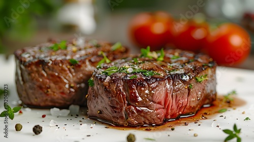 Grilled beef filet mignon steaks, medium rare, juicy center, seared exterior, white marble countertop, fresh herb garnish, coarse salt flakes, olive oil sheen.