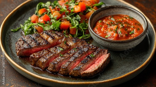 Grilled beef steak with herb and spices. Portion of fried meat cuts with rosemary, garlic, olive oil and ketchup sauce