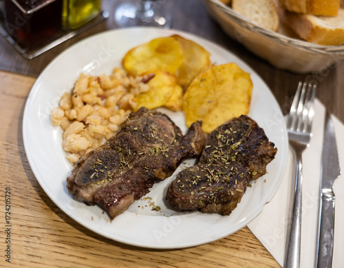 Grilled beef with spices and herbs with potatoes and beans on a white plate. Meat dish according to a traditional Spanish recipe