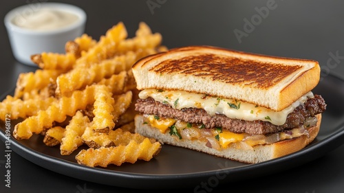 Grilled cheese sandwich with double patty and crinkle fries on black plate, perfect comfort food delicious meal