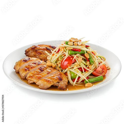 Grilled Chicken and Papaya Salad: A culinary delight showcases succulent grilled chicken alongside a vibrant papaya salad, served on a pristine white plate.
