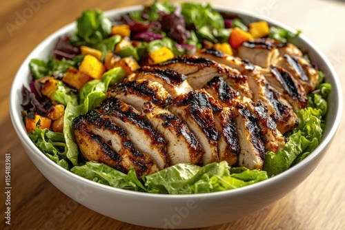 Grilled chicken breast salad with roasted butternut squash and mixed greens.