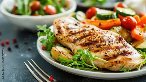 Grilled Chicken Breast with Fruit and Vegetable Salad: Juicy, Seasoned Poultry Paired with Crisp Greens, Fresh Fruits, and Vibrant Veggies—A Nutritious, Balanced Meal Bursting with Flavor